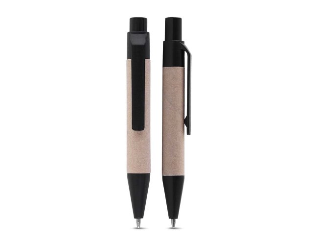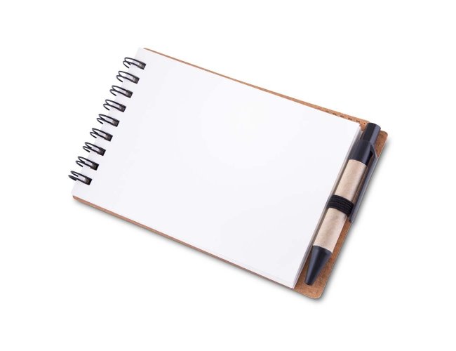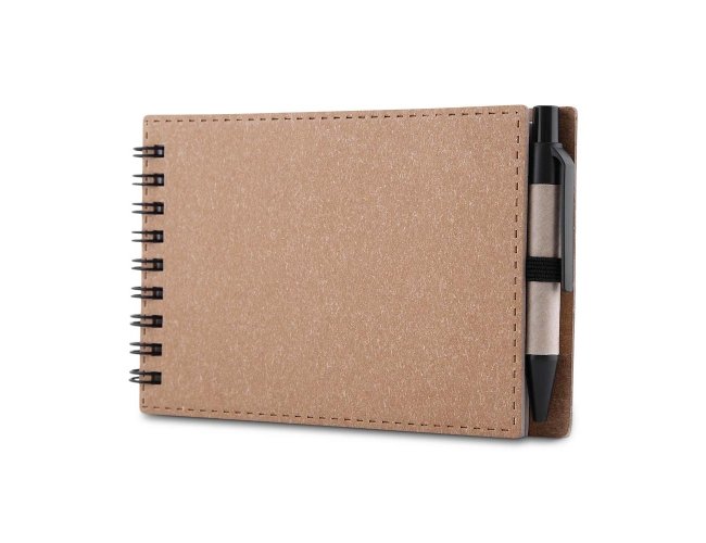 Bloco de notas com capa dura em papelão encadernação em Wire-O e elástico porta-canetas. Possui aproximadamente 70 folhas sem pauta e acompanha caneta com corpo em papelão, acionamento por clique, ponteira e clipe em plástico, além de carga esferográfica azul de 1,0 mm.