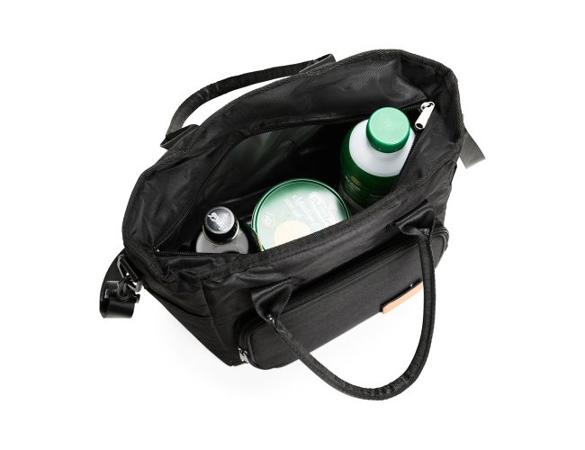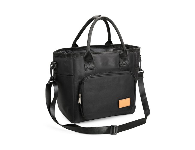Bolsa térmica com capacidade de até 10 litros. Confeccionada em Oxford 300D catiônico resistente à água, possui fechamento em zíper e revestimento térmico antivazamento em PEVA atóxico. Conta ainda com bolso frontal com plaquinha de couro sintético fixada com velcro, um par de bolsos laterais e duas alças fixas para transporte, além de uma alça transversal regulável com mosquetões para encaixe nas fivelas laterais da bolsa.