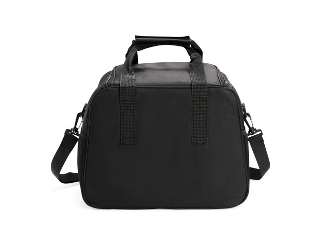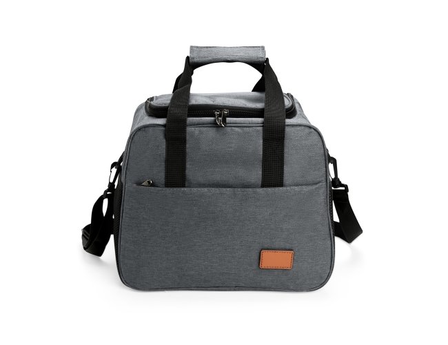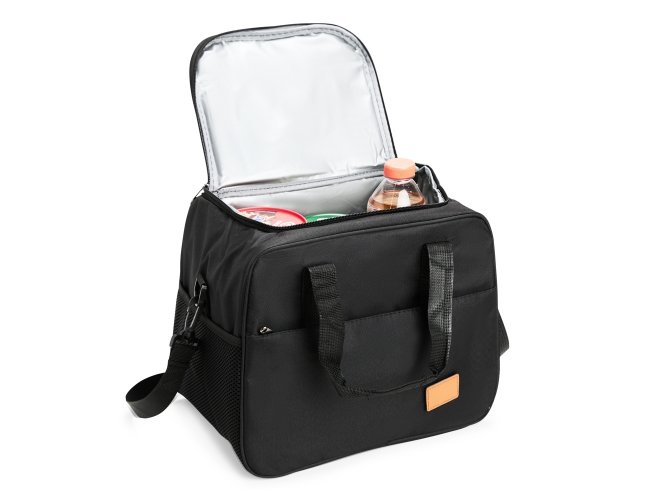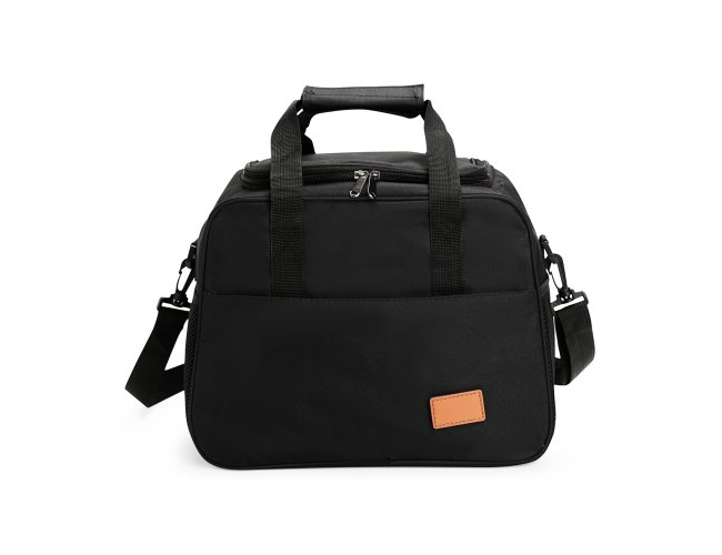 Bolsa térmica confeccionada em Oxford com fechamento em zíper e capacidade de até 20 litros. O compartimento interno possui revestimento térmico em PEVA. Conta com compartimento frontal de zíper, um par de bolsos laterais em tela de tecido respirável com elástico. Apresenta ainda duas alças de mão com suporte de juntura e alça transversal regulável e removível, com mosquetões para encaixe nas fivelas laterais. Acompanha plaquinha em couro sintético fixada com velcro.