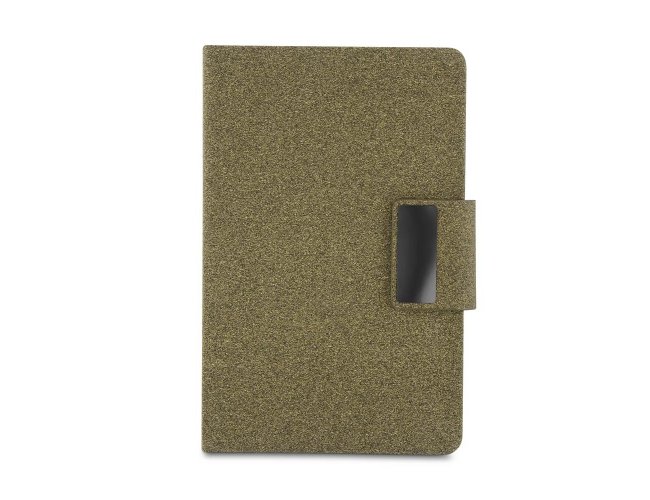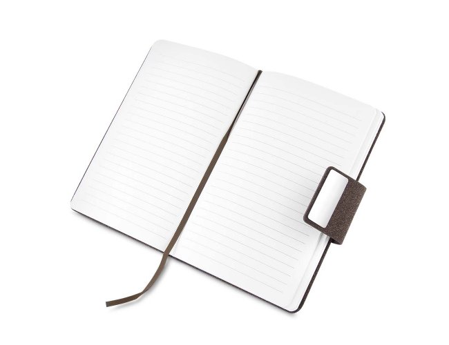 Caderneta com capa em PU revestida com fibra de café ou chá, engate para caneta com fecho magnético e placa metálica, marcador de páginas em fita de cetim e cerca de 80 folhas pautadas.