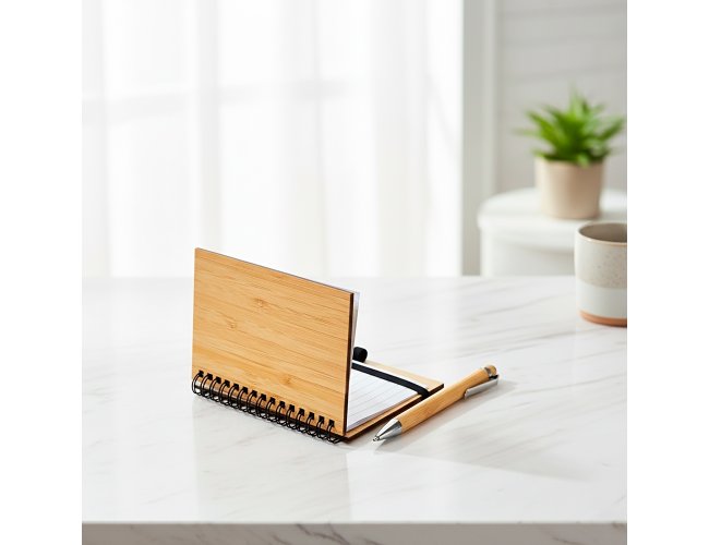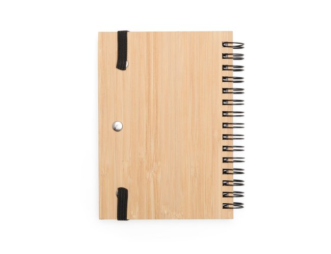 Caderno com capa dura feita em bambu, encadernação Wire-O, porta-canetas e fechamento em elástico. Contém aproximadamente 50 folhas brancas com pauta. Acompanha caneta esferográfica com carga azul de 1,0 mm, corpo em bambu, acionamento por clique, além de clip e ponta em metal.