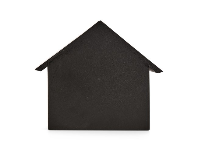 Calendário de mesa permanente em madeira com formato de uma casa. De uso intuitivo, conta com dois cubos para os dias do mês em formato numérico e três blocos com os nomes dos meses para atualização manual de data.