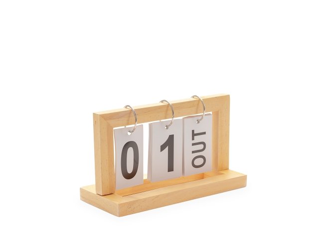Calendário permanente de mesa com estrutura em madeira e fichas de papel cartão presas por argolas de ferro, que permitem organizar os dias em números e os meses em versões abreviadas. Acompanha chave Phillips pequena e dois parafusos para montagem.