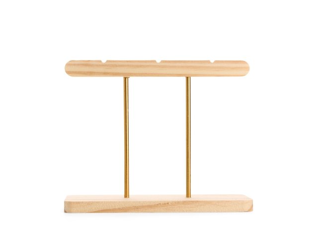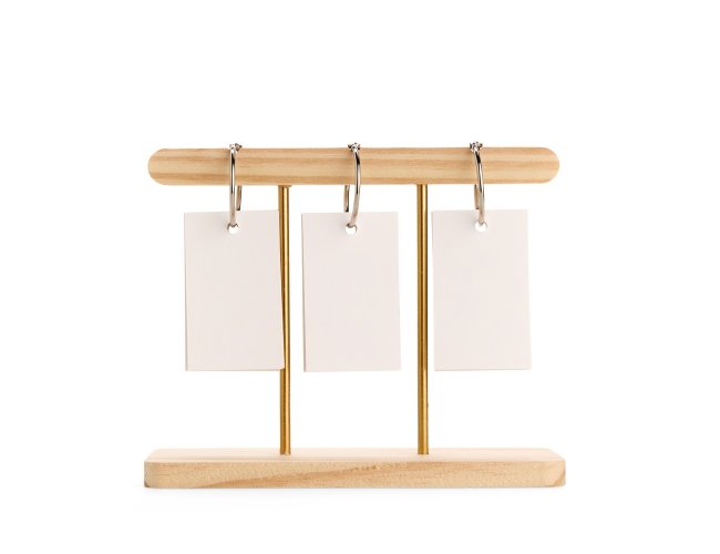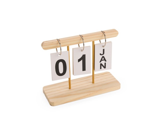 Calendário permanente de mesa com estrutura em madeira e metal. Conta com fichas em papel cartão que exibem os dias e os meses, além de argolas metálicas para organizar as fichas e deixar a montagem intuitiva.