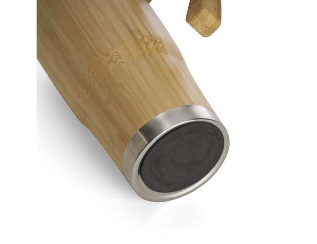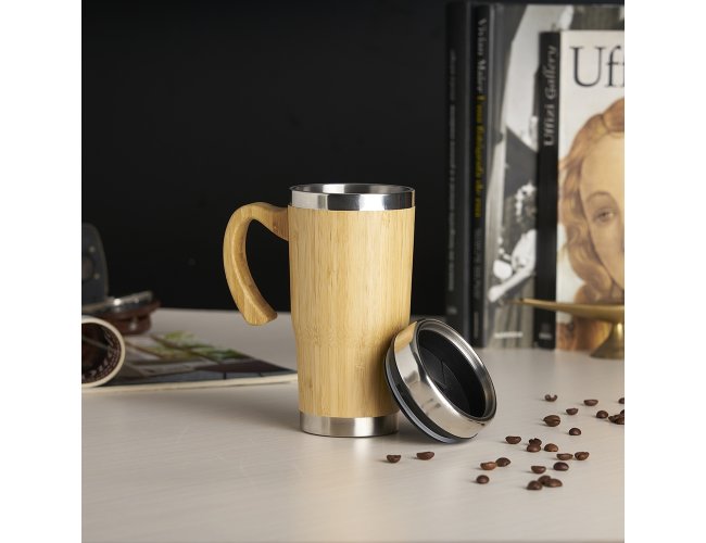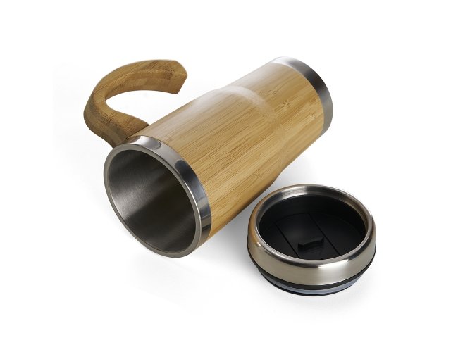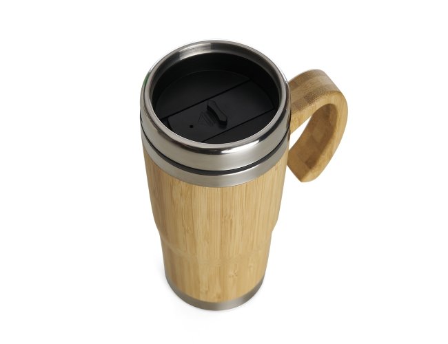 Caneca Bambu de 450ml, pegador de bambu e parte interna em inox. Possui tampa com compartimento que pode ser aberto para beber.