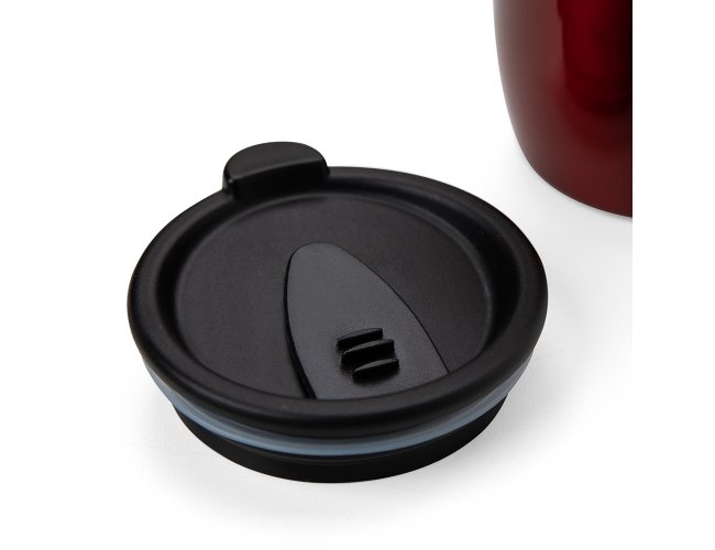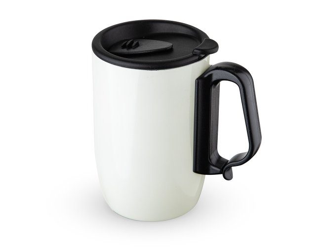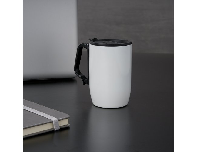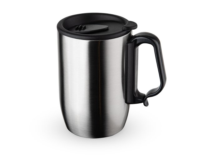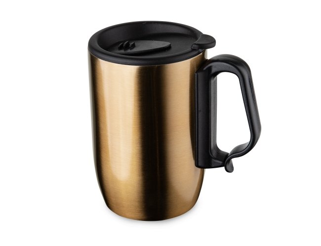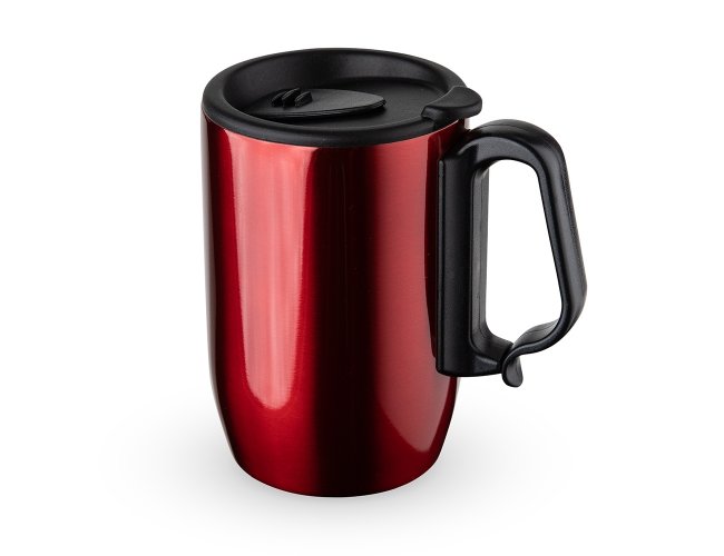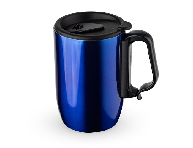Caneca 350ml parede dupla em Inox, com pegador de plástico, contém tampa com compartimento que ao deslizar, pode ser aberto para beber e base com EVA antiderrapante.