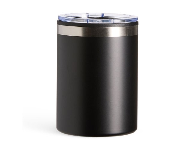 Caneca plástica com capacidade de até 375ml e revestimento externo em inox que reduz o contato direto com a temperatura dos líquidos. Conta com tampa plástica com bocal e trava de segurança, além de base emborrachada antiderrapante.