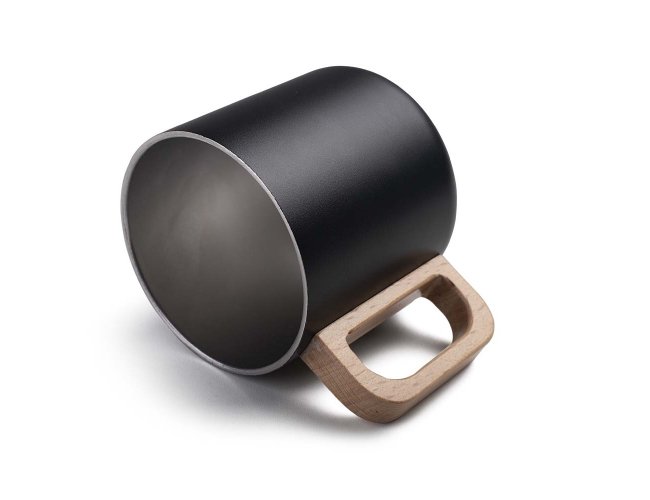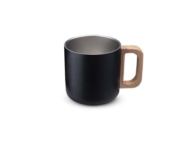 Caneca térmica com parede dupla em inox, pintura externa eletrostática, alça em madeira e capacidade máxima de 400ml.