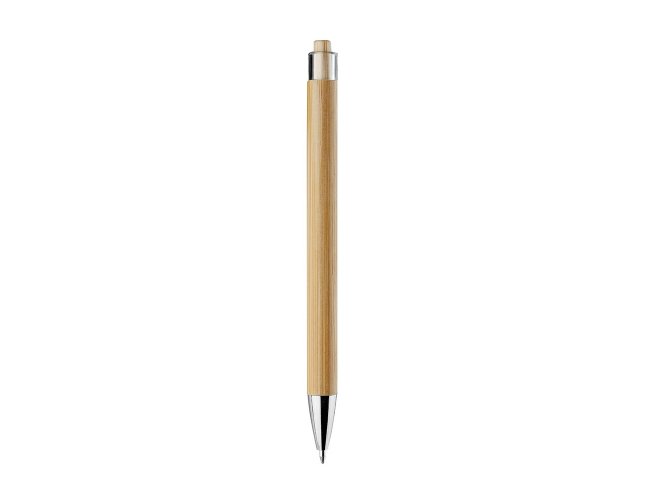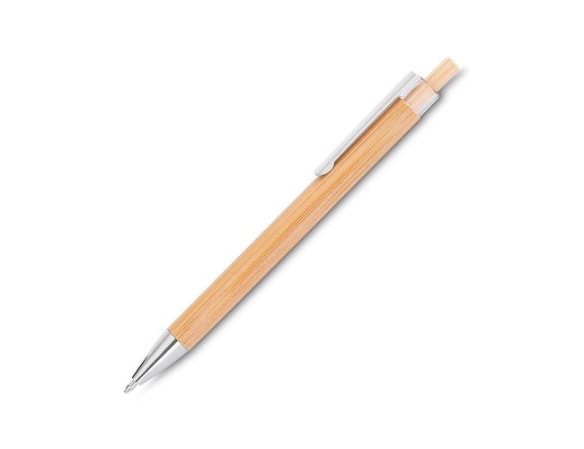 Caneta feita em bambu com acionamento por clique, ponteira e clip metálicos com detalhe em plástico. Possui carga esferográfica azul de 1.0mm.