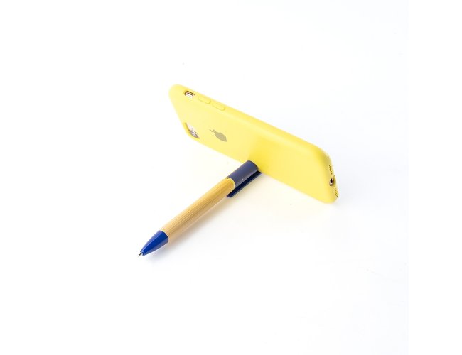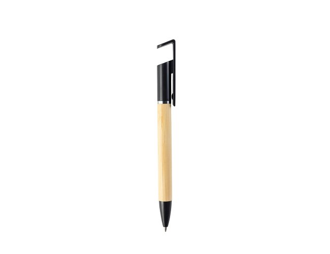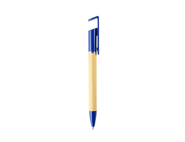 Caneta em bambu com ponta e ponteira com suporte para celular em plástico, acionamento por rotação e carga esferográfica azul de 1.0mm.