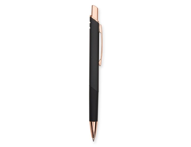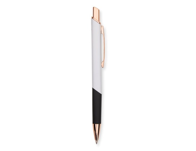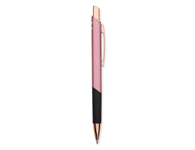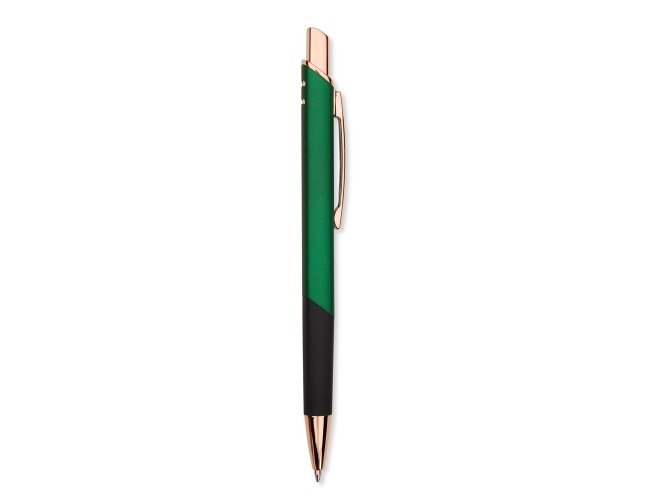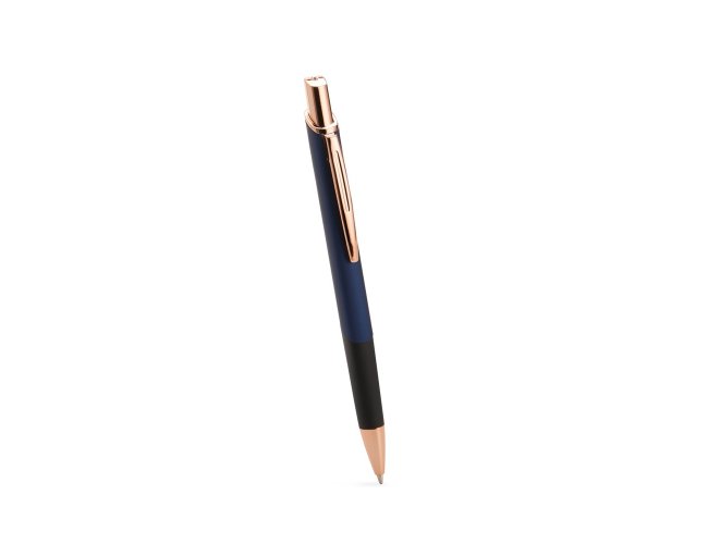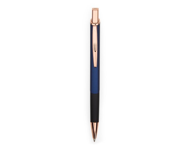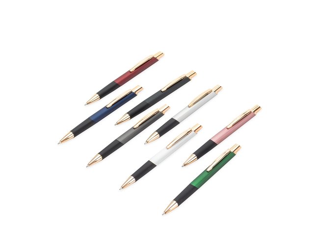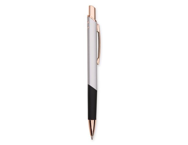 Caneta feita inteiramente em metal com acionamento por clique e carga esferográfica azul de 1,0mm.