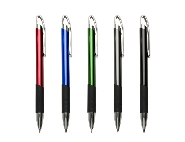 Caneta metálica com detalhe emborrachado, carga esferográfica azul 1.0 mm e acionamento por clique.