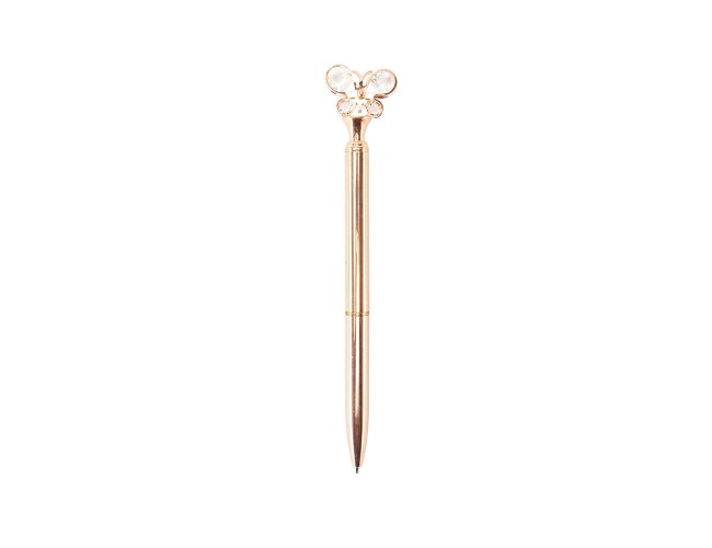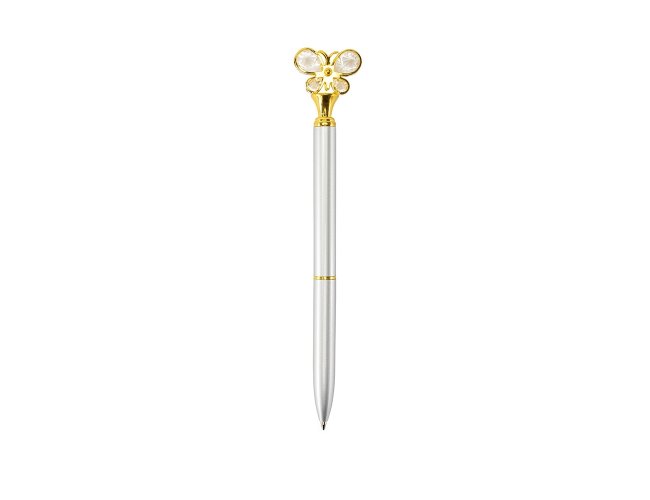 Caneta metálica com detalhes decorativos em formato de borboleta, acionamento por rotação e carga esferográfica azul de 1,0mm.