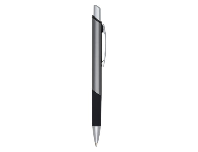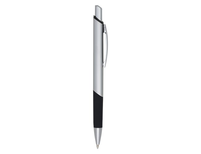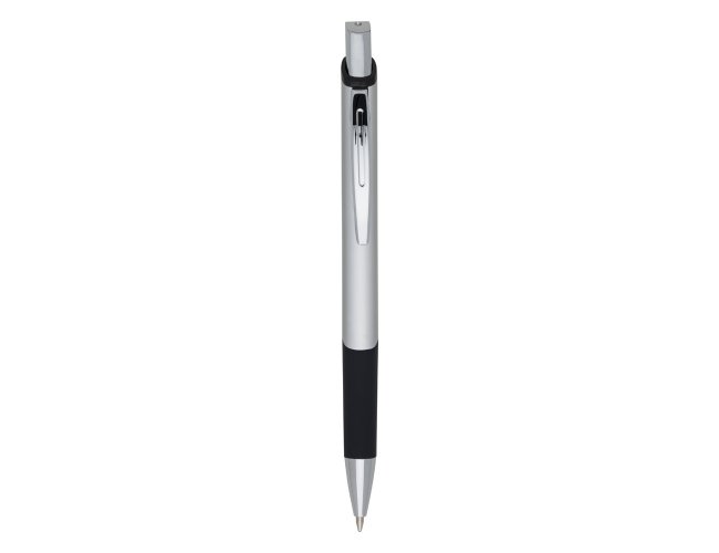 Caneta metálica com design quadrangular, acabamento brilhante (exceto a prata) e detalhe emborrachado, carga esferográfica azul 1.0 mm e acionamento por clique.