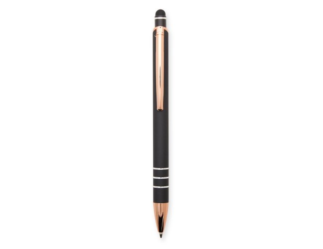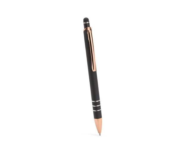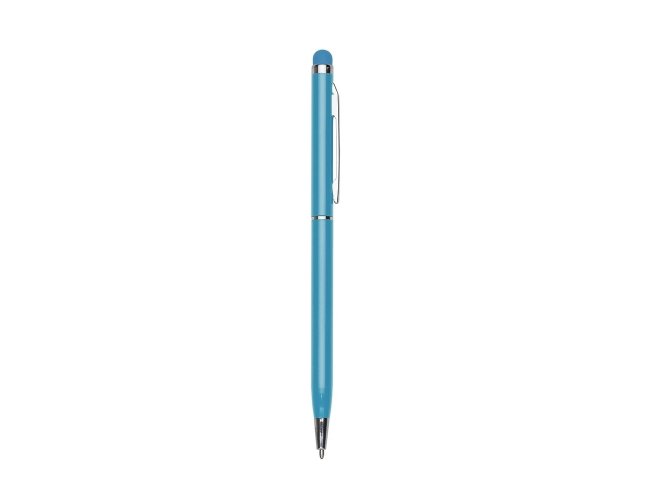Caneta metálica com carga esferográfica azul de 1,0mm e acionamento por clique com acabamento emborrachado para interação em dispositivos com tela sensível ao toque.