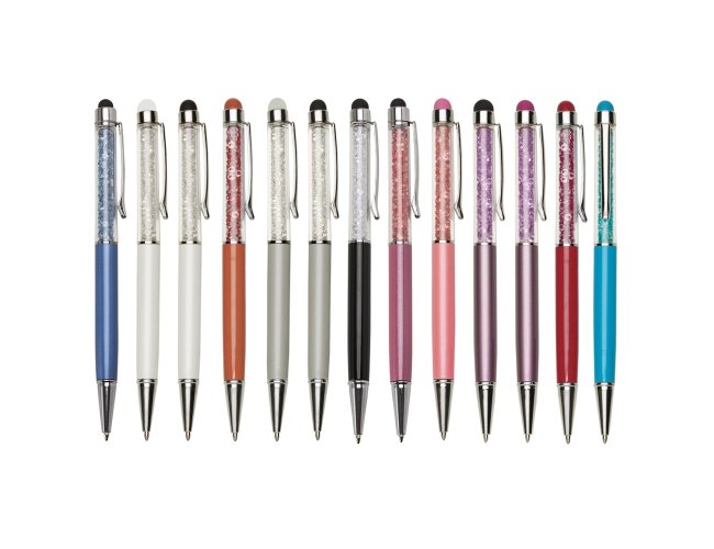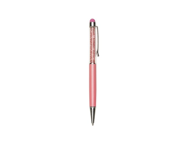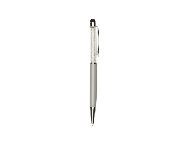 Caneta metálica com touch screen e detalhes em cristal, carga esferográfica azul 1.0 mm e acionamento por rotação.