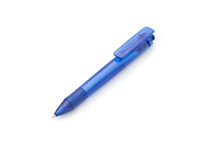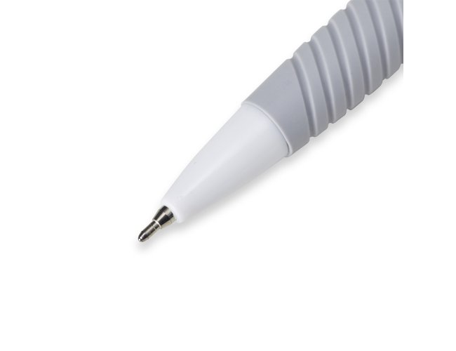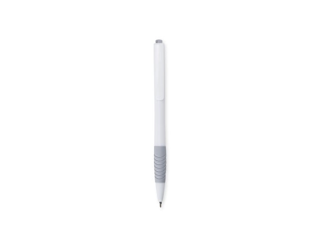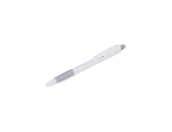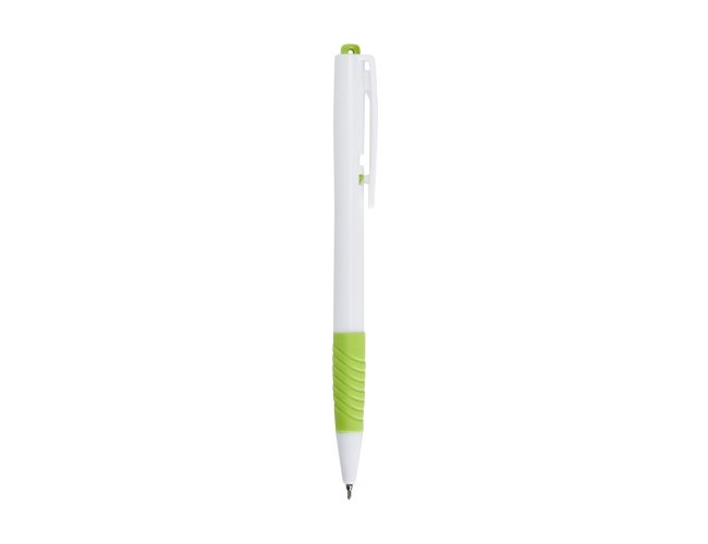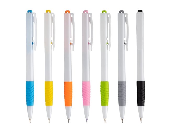 Caneta plástica com detalhe emborrachado e acionamento por clique, carga esferográfica azul 0.8mm.