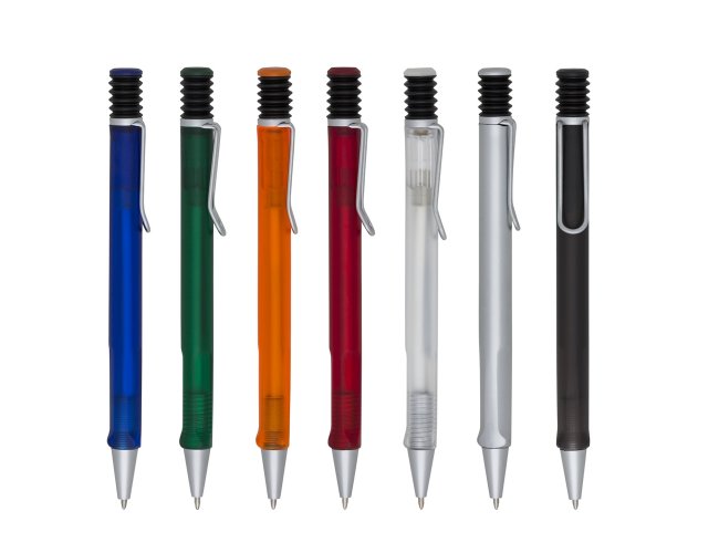 Caneta plástica com carga esferográfica azul e acionamento por clique.