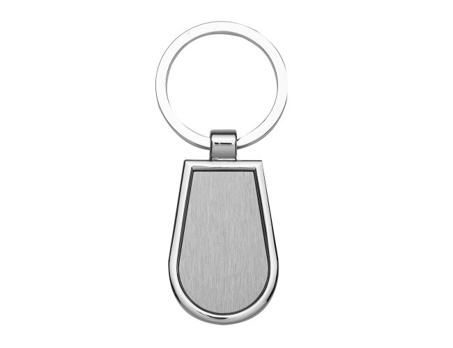 Chaveiro de metal formato gota com chapa central, verso liso.
