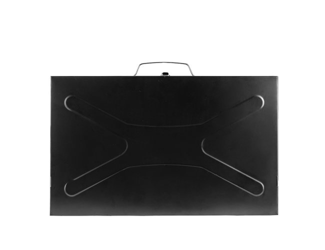 Churrasqueira feita em metal com funcionamento a carvão.Possui formato compacto e pode ser transportada como uma maleta quando desmontada, além de alça para transporte, trava de segurança para fechamento e quatro pés retráteis. Acompanha uma espátula e espeto duplo com cabo em madeira.