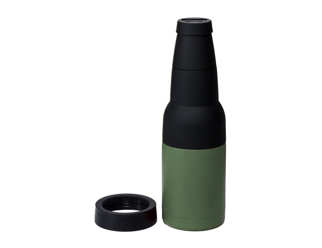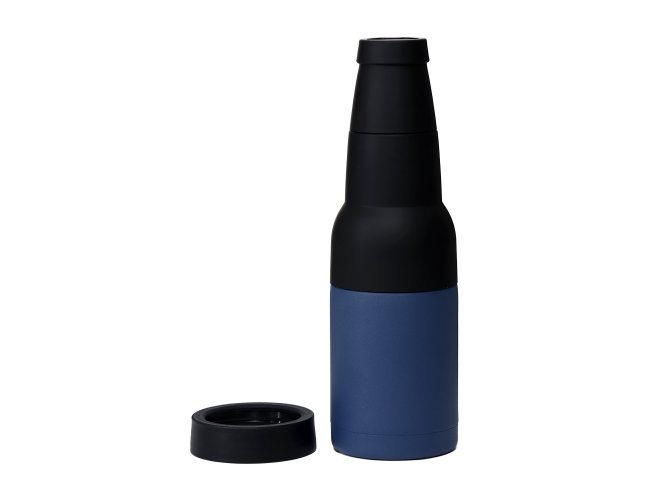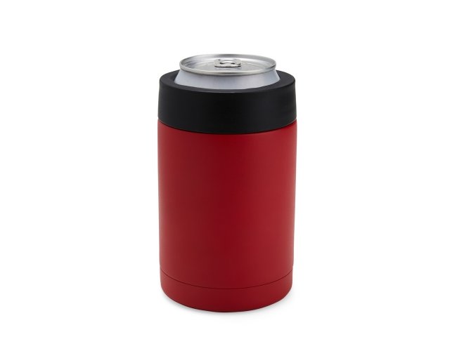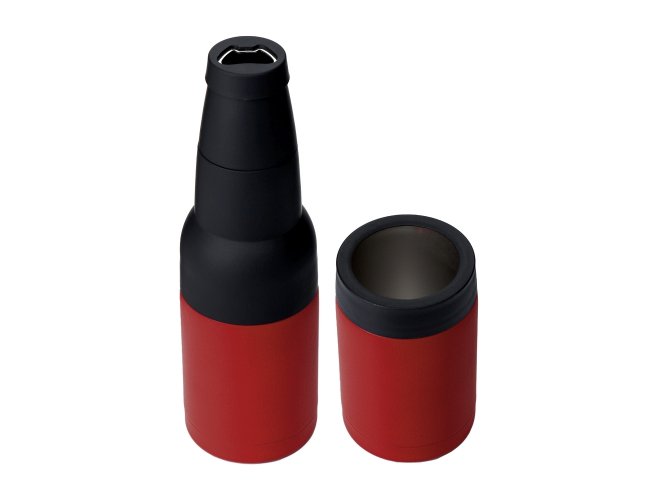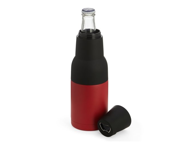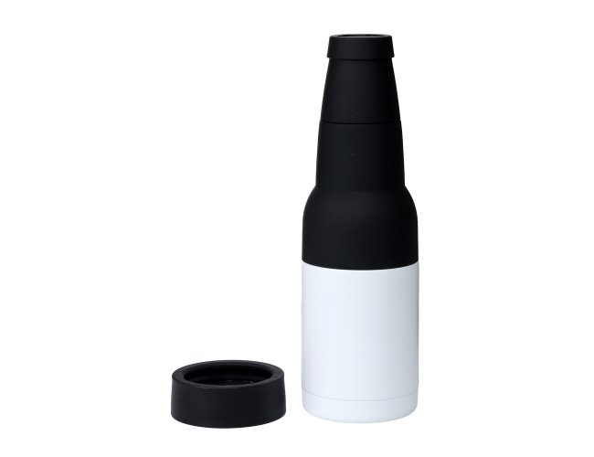 Copo térmico multiuso em inox e plástico, pode ser usado como porta long neck ou porta lata, possui abridor de garrafa.