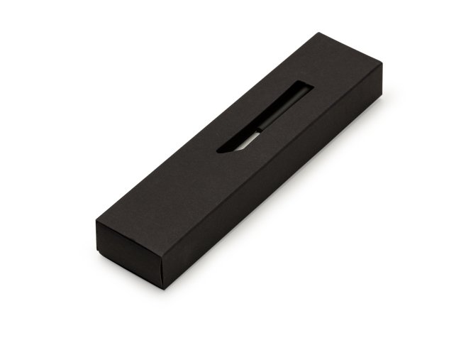 Estojo de papel para uma caneta, possui um visor vazado na capa. Parte interna do estojo tem formato triangular.