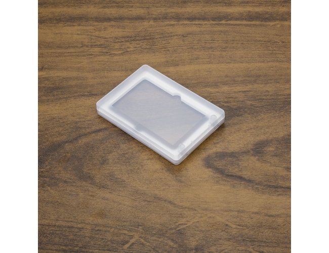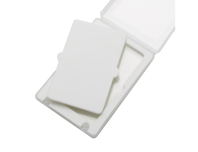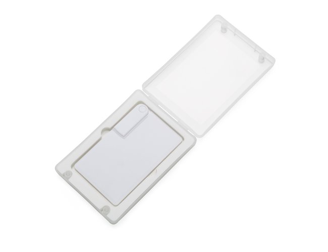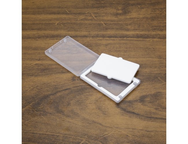 Estojo plástico para pen card transparente, parte interna revestida com espuma e fecha por encaixe.