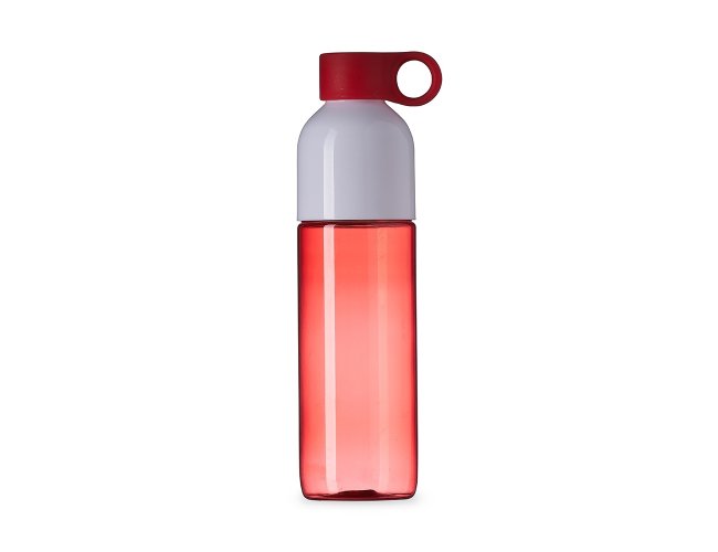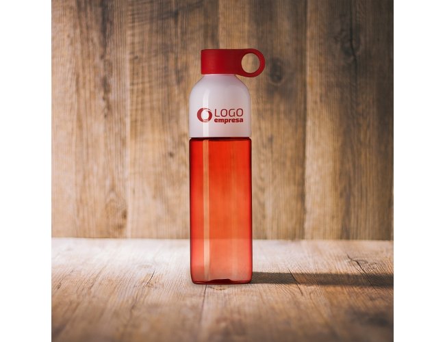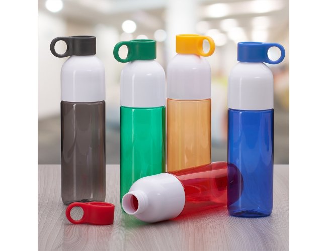Garrafa plástica 700ml com tampa de suporte anelar. Squeeze colorido, possui tampa rosqueável na cor branca; devido sua largura facilita a higienização interna do produto; acompanha tampa colorida de suporte anelar, facilitando o transporte do produto.