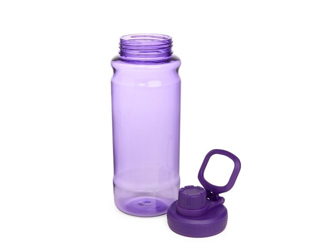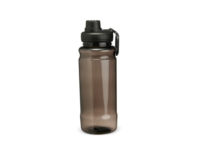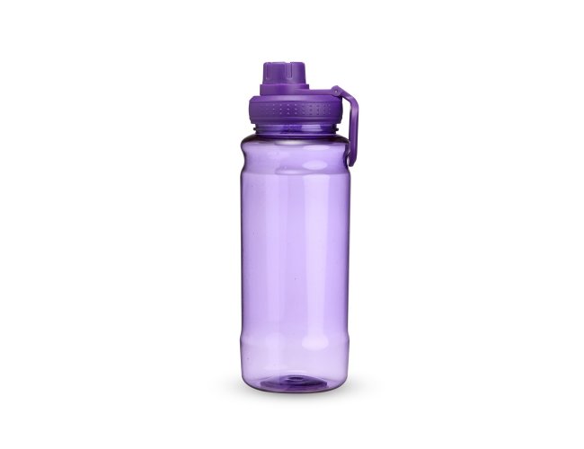 Garrafa plástica com capacidade para até 800ml, possui design ergonômico e tampa rosqueável em plástico com proteção para o bocal e alça superior para transporte.