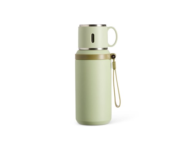 Garrafa térmica em inox com pintura eletrostática e capacidade de até 600ml. Possui estrutura de parede dupla e tampa interna rosqueável com anel de vedação, abertura do bocal por botão de acionamento e infusor. Conta ainda com tampa externa em formato de caneca e alça emborrachada para transporte.