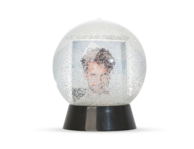 Globo de neve plástico com porta foto. Esfera plástica resistente com glitter na parte interna, base preta pode ser retirada para inserir uma foto no suporte interno. Foto de tamanho 8,5 cm x 4,7 cm.