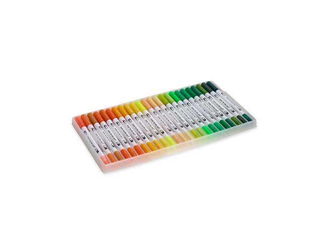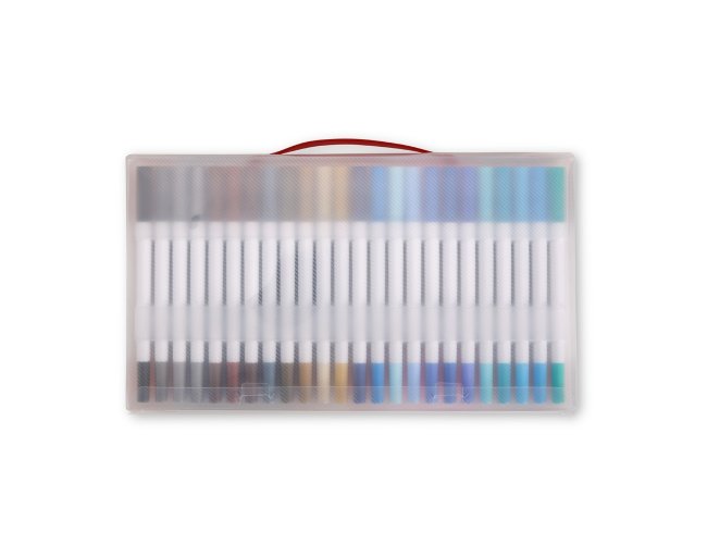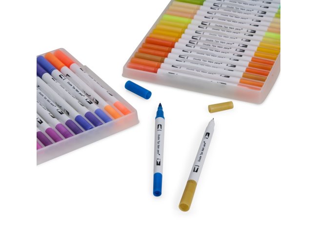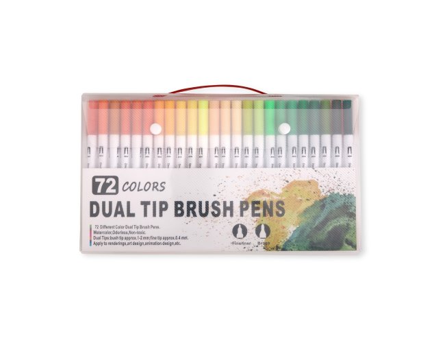 Kit com 72 coloridas de pontas duplas: uma fina e outra em formato de pincel. Cada canetinha possui corpo em plástico e tinta à base de água, livre de odores e atóxica. Acompanha estojo plástico com fechamento em botões e alça para transporte.