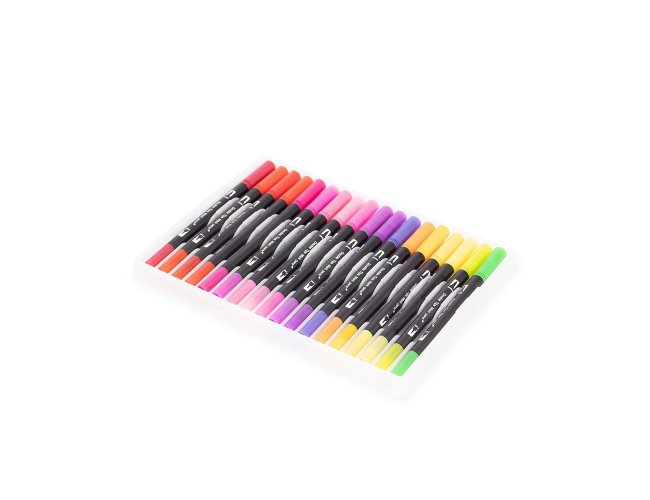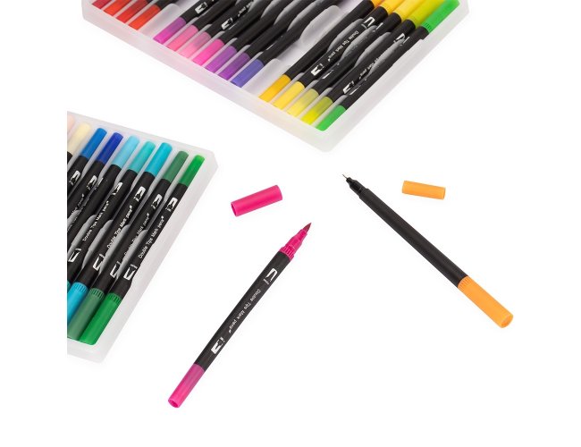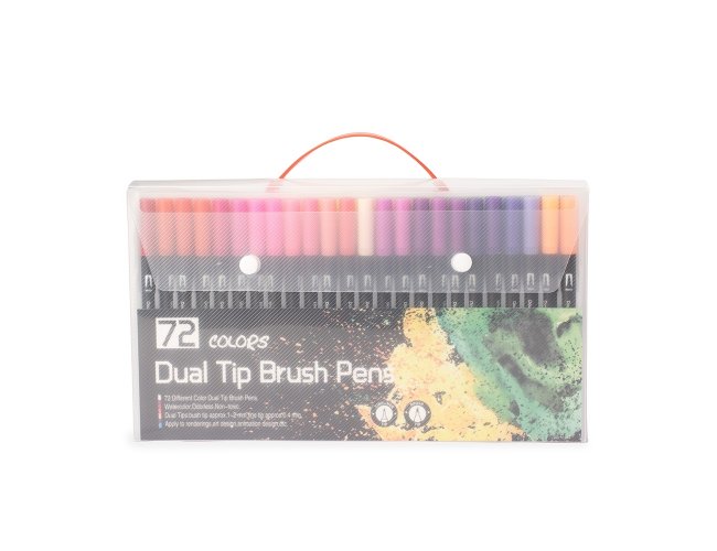 Kit com 72 canetinhas coloridas de pontas duplas: uma fina e outra em formato de pincel. Cada canetinha possui corpo leve em plástico e tinta à base de água, livre de odores e atóxica. Acompanha estojo plástico com fechamento em botões e alça para transporte.