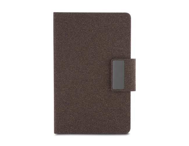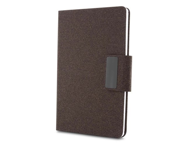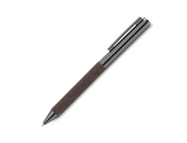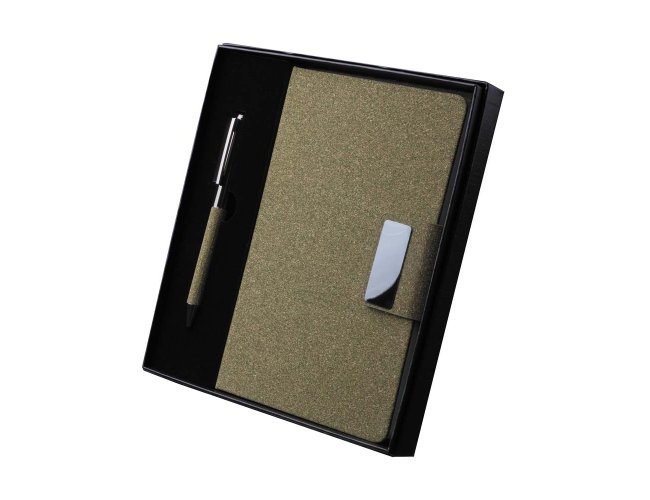 Kit executivo com dois itens. O conjunto é composto por uma caderneta com capa dura em couro sintético revestido com fibra de café, no tamanho A5, com fechamento magnético, marca-páginas em fita de cetim e cerca de 80 folhas pautadas; e uma caneta metálica com detalhes do mesmo material, acionamento por rotação e carga esferográfica azul de 1,0 mm. Acompanha uma caixa de papelão com berço em espuma para a caneta.