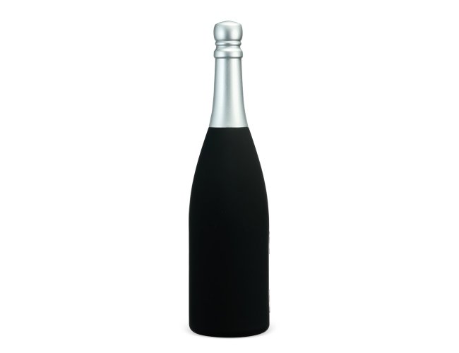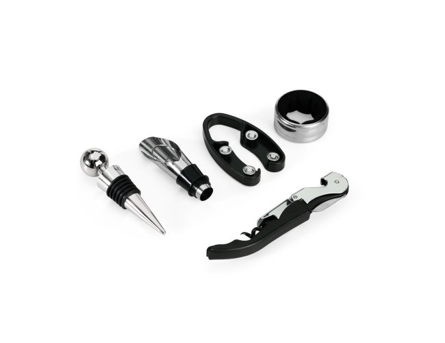 Kit vinho com cinco peças dispostas em um estojo no formato de garrafa, fechamento imantado e interior com berço em espuma. O conjunto contém: tampa de bico, bico condutor com tampa, saca-rolhas metálico três em um com lâmina de corte e abridor de garrafa, um wine collar e cortador de lacre.