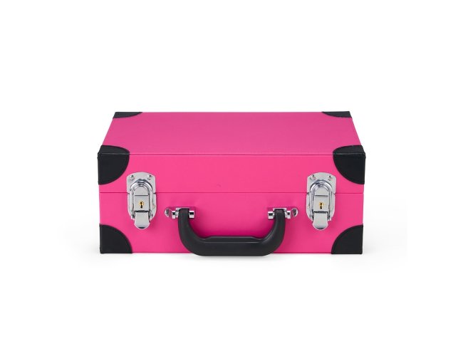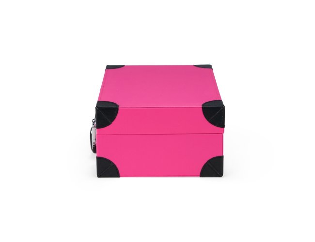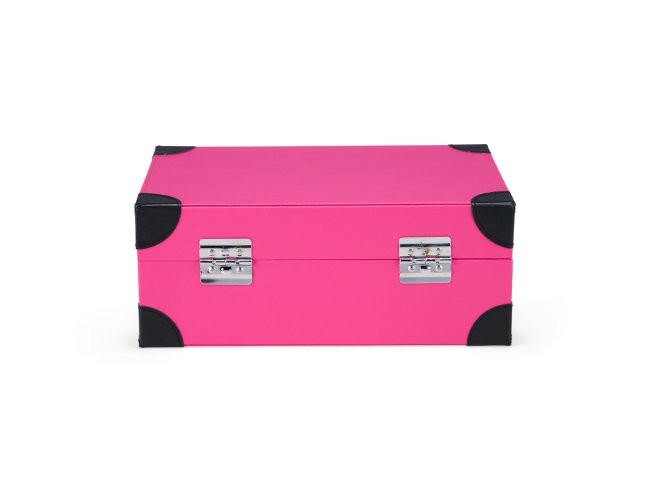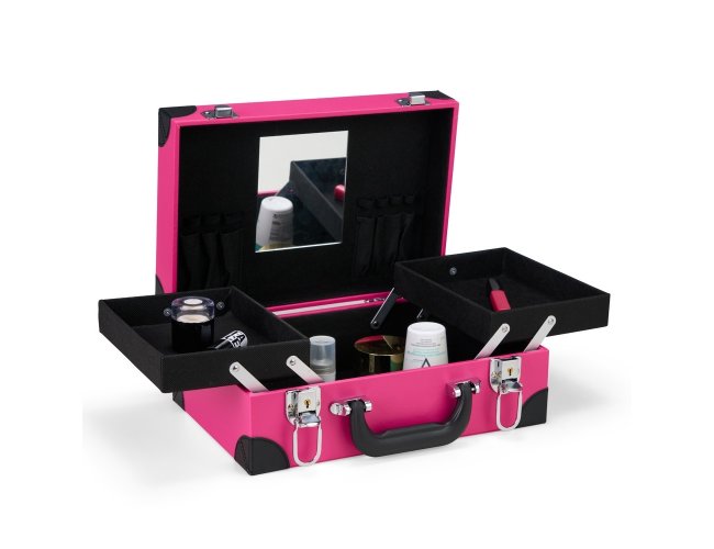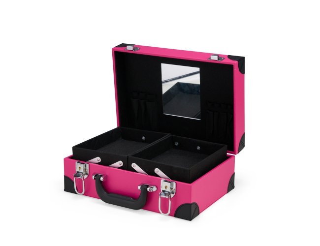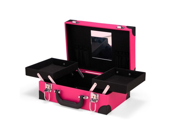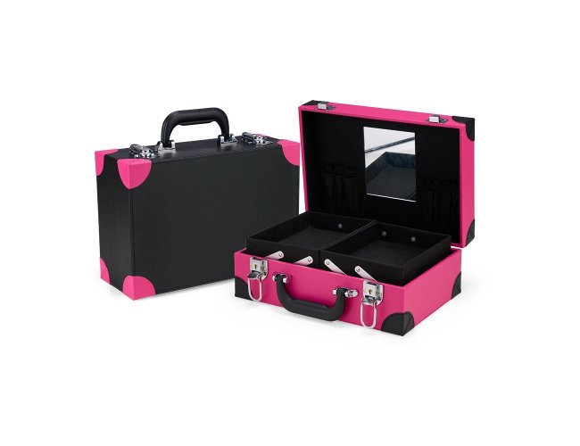 Maleta para itens de maquiagem com revestimento em poliuretano (PU), estrutura em MDF, alça em plástico e travas metálicas com fechaduras. Dispõe de um espelho retangular compacto e bolsos para guardar pincéis na parte interna da tampa, além de duas bandejas móveis para a organização de objetos variados. Acompanha duas chaves para fechamento da maleta.