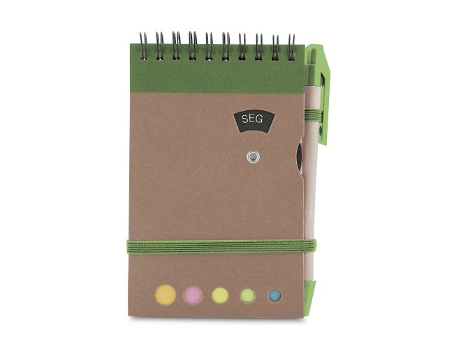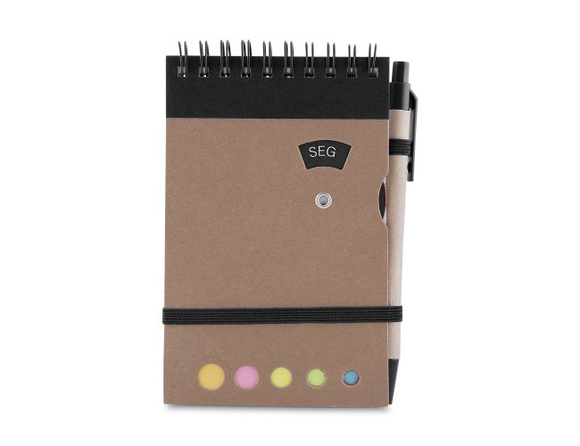 Mini Caderno com capa em papel kraft, com 70 folhas pautadas e blocos adesivos (sticky notes) coloridos. Acompanha disco rotativo na capa com os dias da semana e caneta produzida em papelão reciclado com detalhes em plástico e escrita em azul.