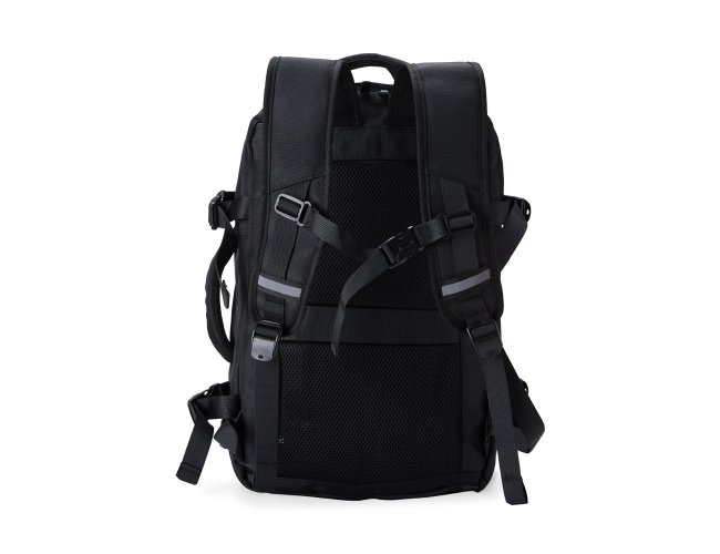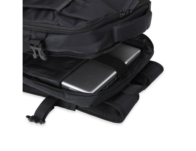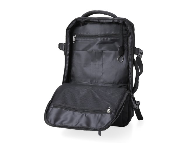 Mochila de nylon 20 litros com quatro compartimentos, sendo o principal com bolso para notebook 15,6 e tablet 12,4. Com divisórias internas para acessórios e porta chave, a mochila possui adaptador USB externo, alça para encaixe em malas de viagem, alças de compensação, duas alças de mãos, área costada com revestimento espumado e alças para as costas com faixas refletivas e revestimento espumado.
