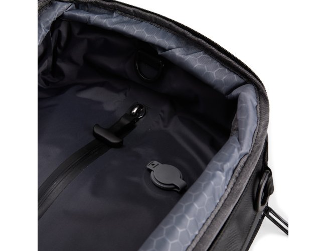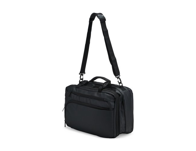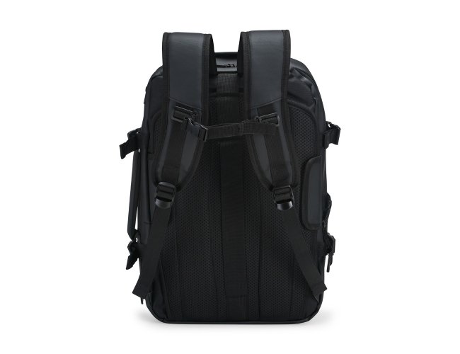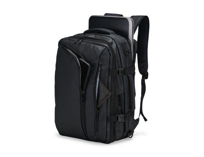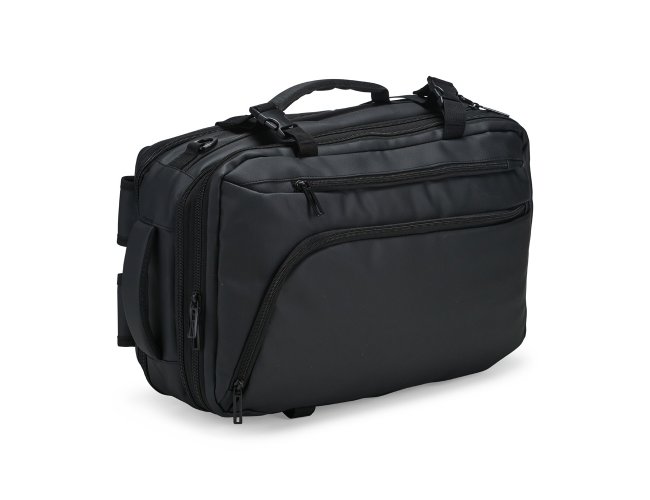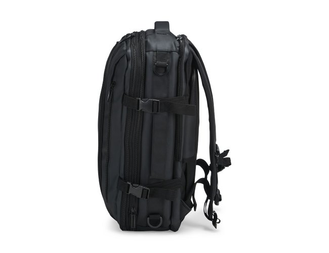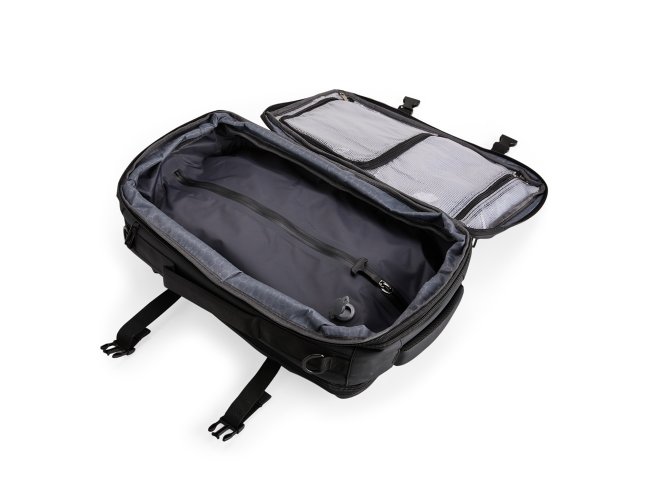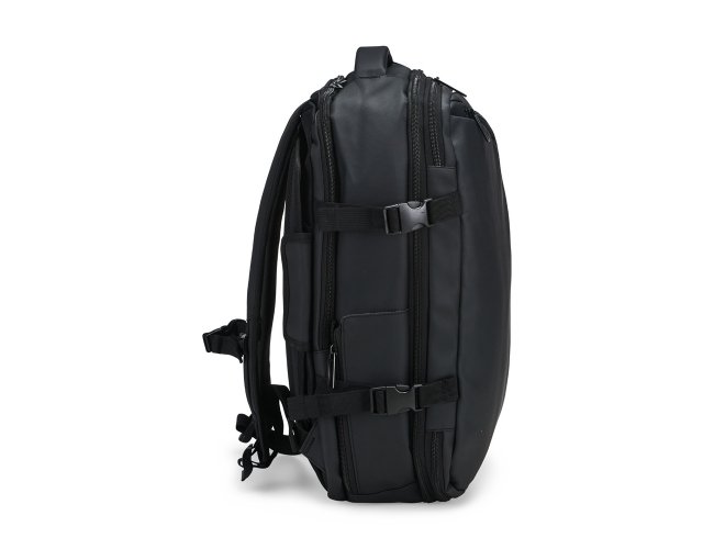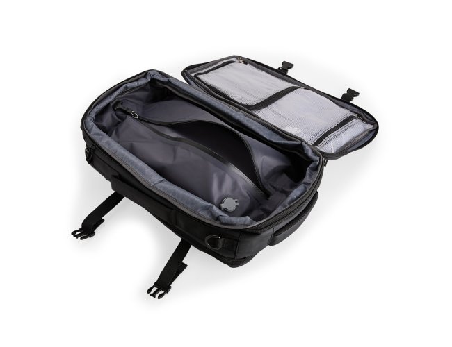 Mochila em nylon com uma camada de PU impermeável com capacidade máxima de 28 litros. Possui um compartimento interno a com sistema de vedação vácuo para guardar roupas e outros objetos (bomba compressora não incluído) e duas divisórias em poliuretano termoplástico de tamanhos diferentes, além de bolsos frontais, um lateral em tela e outro traseiro com divisória para notebook de até 15,6 polegadas. Dispõe ainda de alças acolchoadas em espuma respirável, uma alça lateral para transporte horizontal e outra para ombro ajustável em nylon.