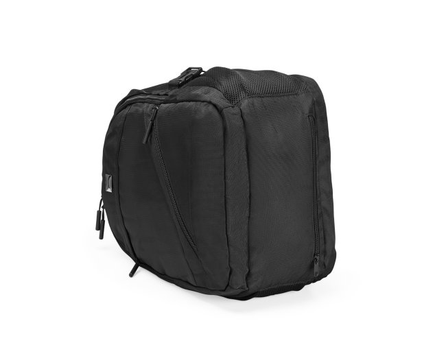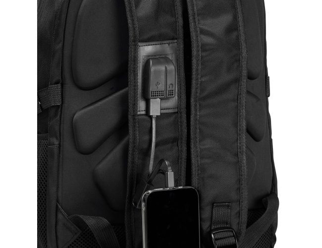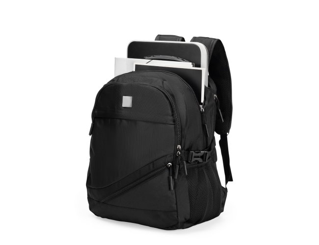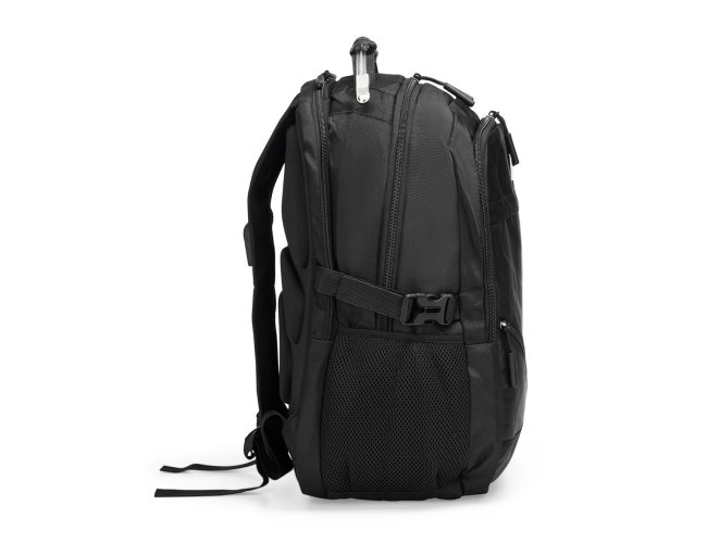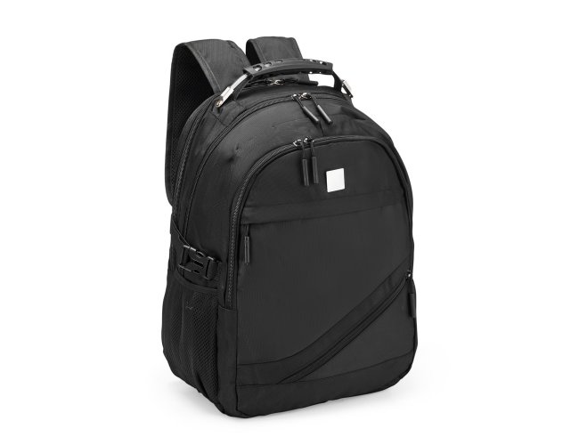 Mochila confeccionada em PVC Jacquard com mescla em seda, resistente à água, fechamento em zíper no compartimento principal e capacidade de até 23 litros. Possui uma placa metálica para personalização, três compartimentos frontais, dois bolsos laterais em tela de nylon e bolso traseiro para notebook de até 15,3 polegadas. Conta ainda com engates laterais ajustáveis, alça superior em plástico e silicone, alças acolchoadas, adaptadores USB e P2 e painel traseiro estofado. Acompanha capa protetora em tecido sintético.