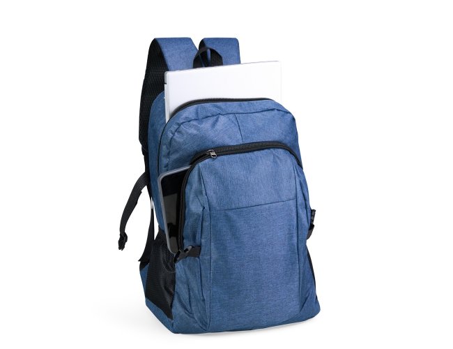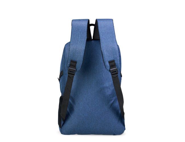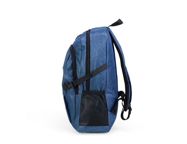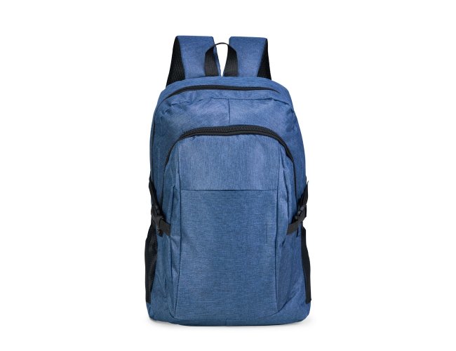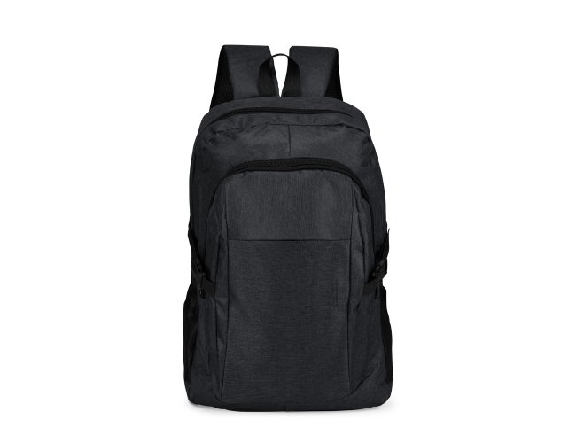 Mochila confeccionada em Oxford 300D resistente à água com capacidade máxima de 14 litros. Possui compartimento principal com divisória para organização de objetos internos e outro, localizado na parte frontal, com três bolsos internos em diferentes tamanhos. Conta ainda com bolsos laterais em tela de malha com elástico, um par de fivelas de engate lateral em plástico, alça superior em nylon e alças para as costas com revestimento externo em tecido respirável.