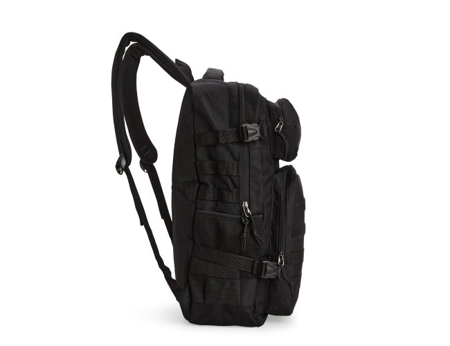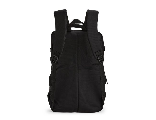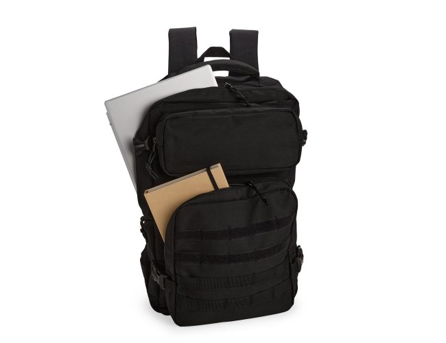 Mochila em Oxford 600D impermeável, fechamento em zíper com fechamento em zíper e puxadores em cordão de nylon, e capacidade de 24 litros. Possui divisória interna para notebooks de até 15,6 polegadas. Conta com dois compartimentos frontais de tamanhos diferentes, sendo um com tiras em velcro para fixação de patches e costura compatível com o encaixe de bolsos modulares, além de dois bolsos laterais em tela de nylon com elástico e cintas compressoras laterais. Dispõe ainda de alça superior e duas alças acolchoadas para as costas. Acompanha plaquinha metálica personalizável.