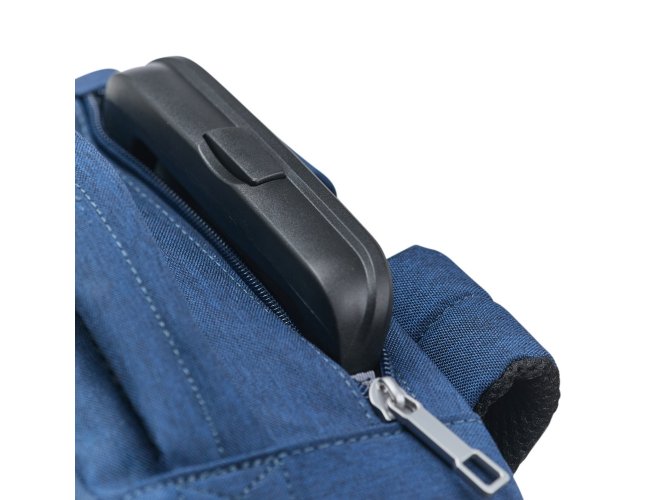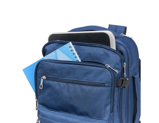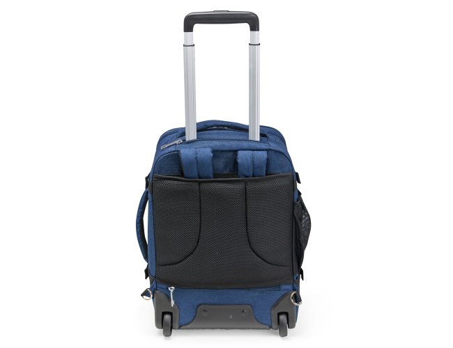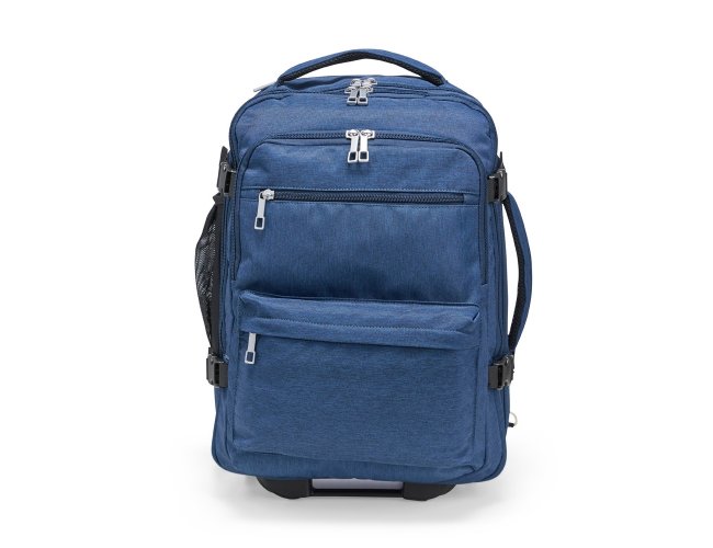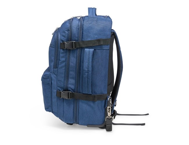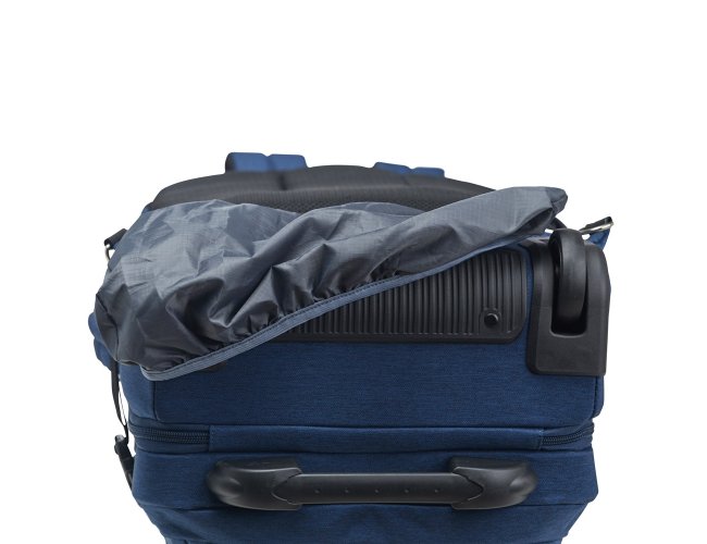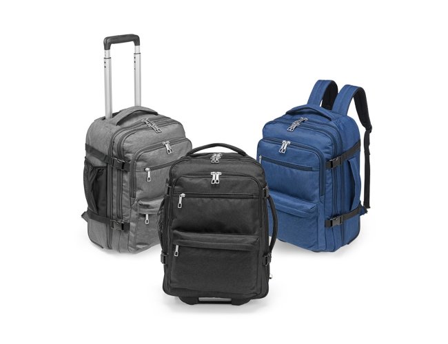 Mochila em poliéster impermeável com capacidade para até 24 litros. Possui compartimento interno principal com dois bolsos de fechamento em zíper e cinta compressora para roupas. Conta ainda com dois compartimentos frontais, sendo um deles com divisória para notebooks de até 15,6 polegadas, um par de bolsos menores com fechamento em zíper e um bolso lateral em tela de nylon. Dispõe também uma alça retrátil contida em um compartimento fechado em zíper e duas rodinhas para oferecer mais uma possibilidade de uso, além de duas alças de mão, uma na parte superior e outra na lateral, permitindo o transporte pela horizontal, e duas alças para as costas com revestimento em tecido acolchoado.