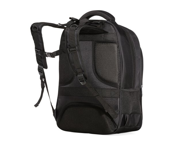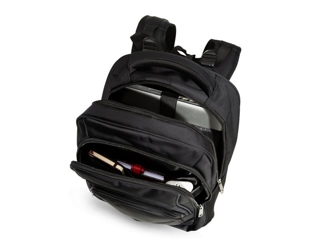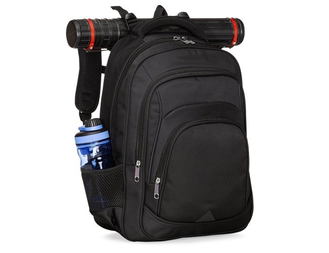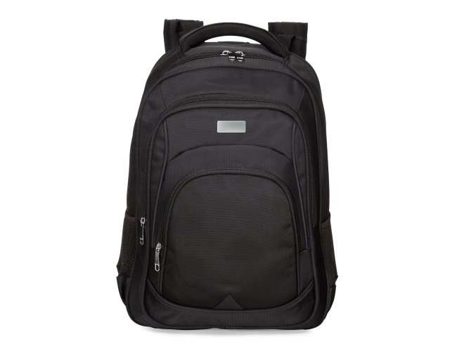 Mochila confeccionada em poliéster impermeável com capacidade máxima para 24 litros. Possui três compartimentos, um deles com bolso para notebooks de até 15,6 polegadas. Conta ainda com bolsos laterais em malha, alça para encaixe em malas de viagem, alças de compensação, duas alças de mãos e área costada com revestimento espumado. Acompanha plaquinha metálica para personalização.