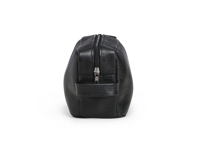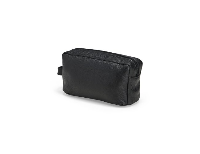 Nécessaire em couro, com fechamento em zíper, alça lateral de mão e plaquinha presa a cordão de nylon.