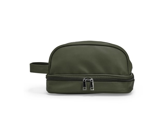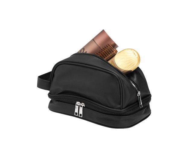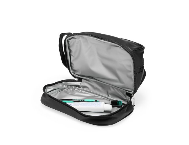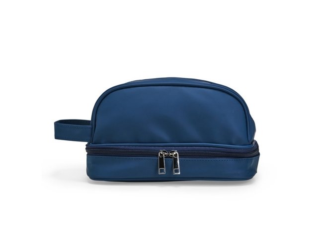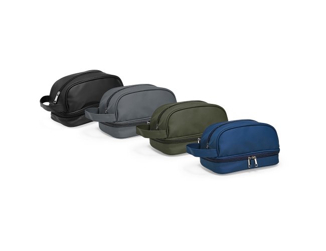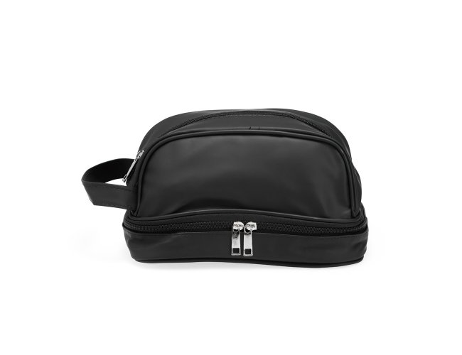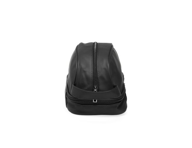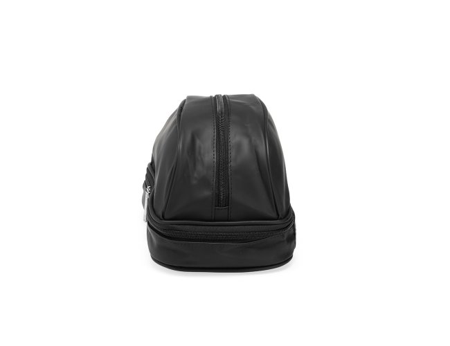 Nécessaire confeccionada em couro sintético impermeável. Possui alça lateral de mão e dois compartimentos com fechamento em zíper: o principal, na parte superior, e outro na parte inferior, ideal para guardar itens úmidos.