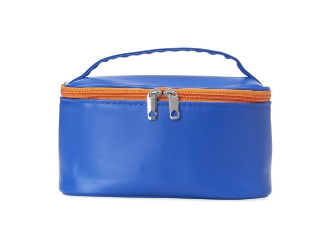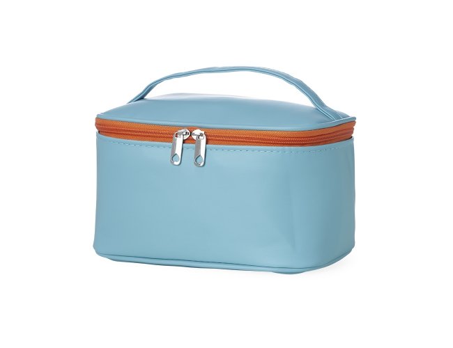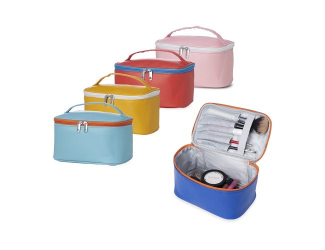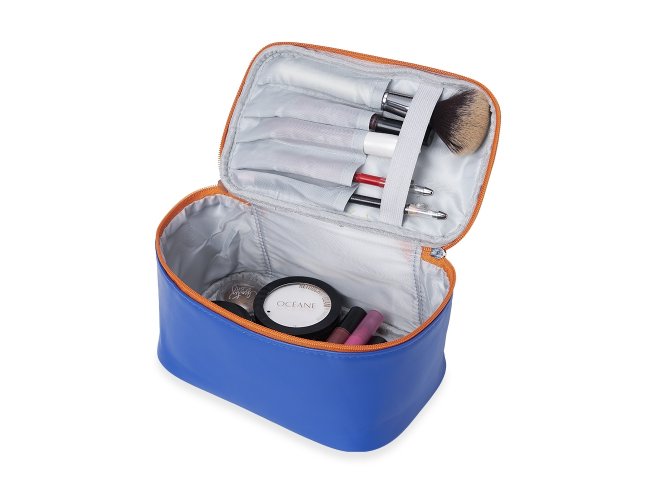 Nécessaire em poliuretano (PU) impermeável, alça de mão e fechamento em zíper. Possui divisórias e elástico interno na tampa para organizar itens de maquiagem, como lápis e pincéis.