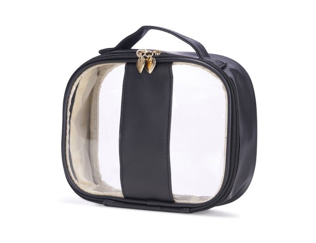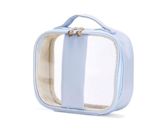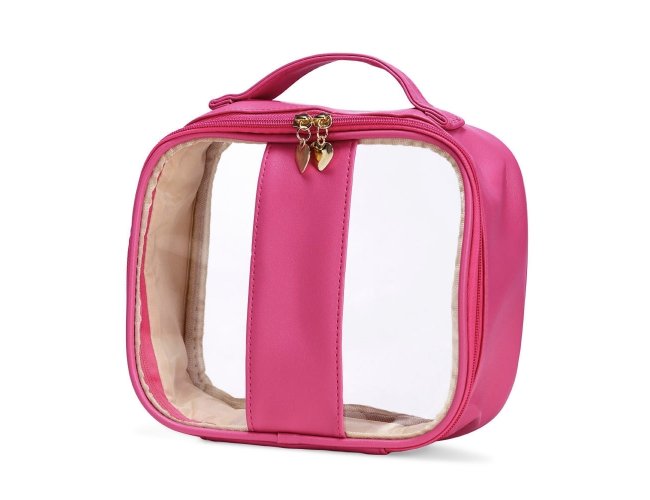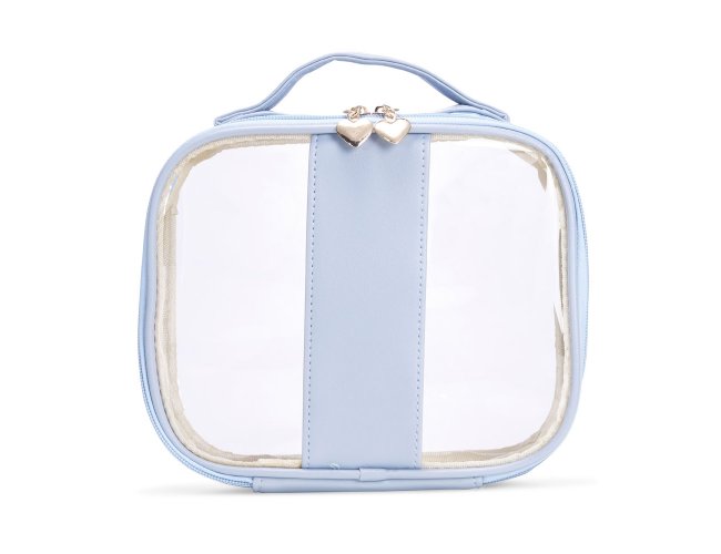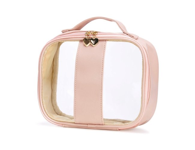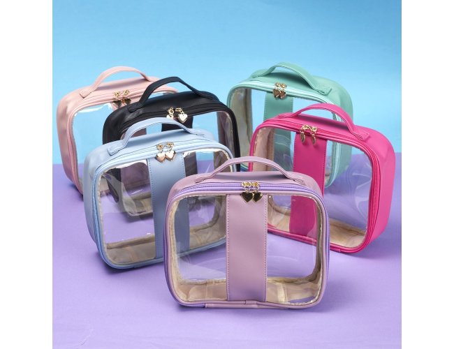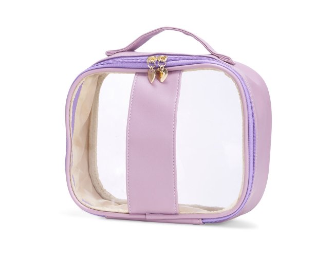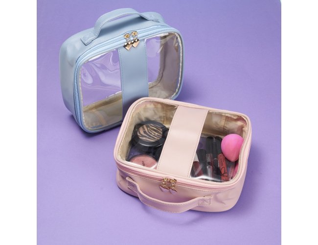 Nécessaire impermeável em PVC com bordas em PU. Conta com alça superior de mão, fechamento em zíper e puxadores no formato de coração.