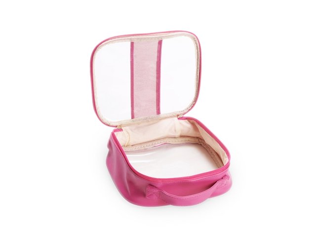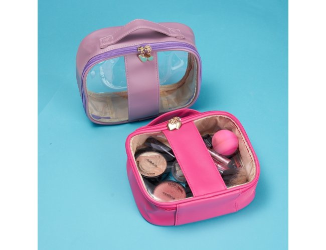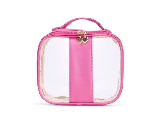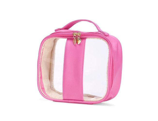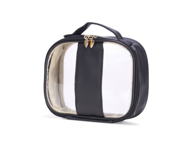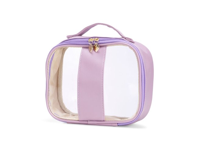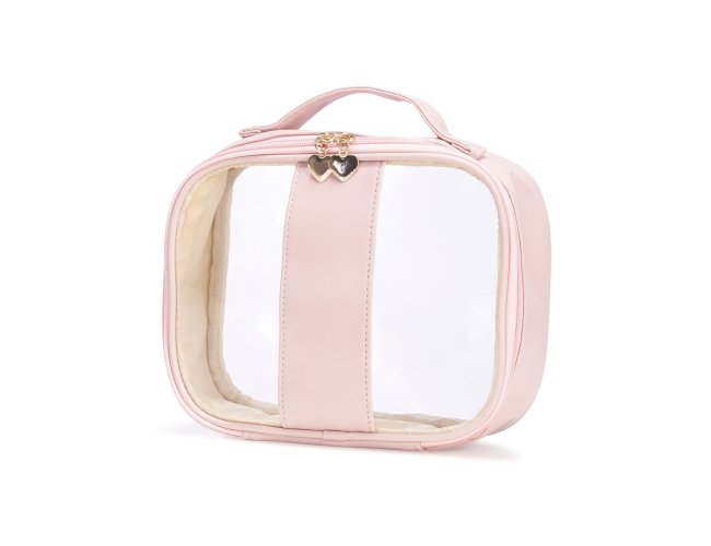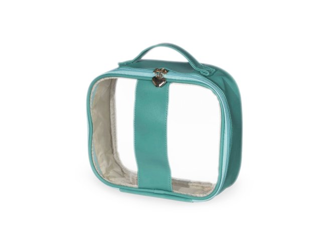Nécessaire impermeável em PVC com bordas em PU. Conta com alça superior de mão, fechamento em zíper e puxadores no formato de coração.