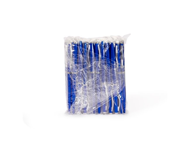 Pacote com 50 peças da caneta plástica com carga esferográfica azul e acionamento por rotação.